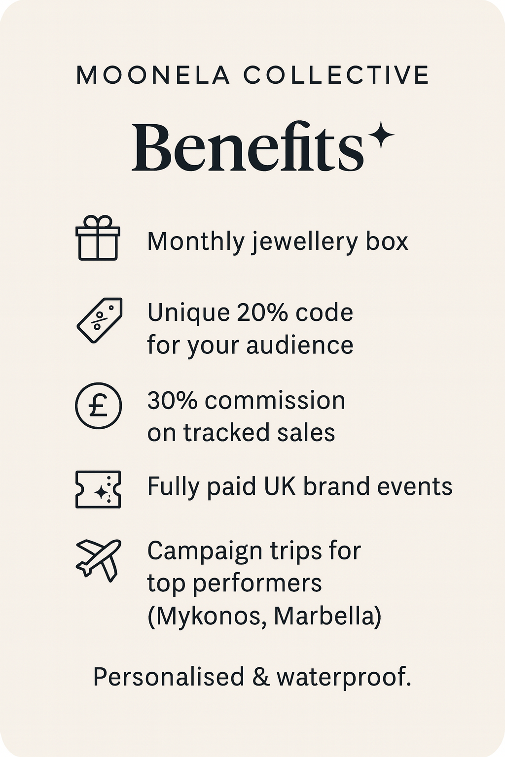 Erhalten Sie jeden Monat kostenlosen Schmuck , Ihren eigenen 20 %-Code für Ihr Publikum und 30 % Provision auf verfolgte Verkäufe .