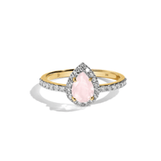 Featuring 29 lab-grown diamonds (total weight 0.33 ct, color I, clarity SI) alongside a genuine Moonela rose quartz centerpiece, this adjustable ring embodies elegance and heartfelt emotion. The delicate 1 mm band perfectly frames a 7 mm x 5 mm pear-shaped rose quartz (rose cut), complemented by brilliant round-cut diamonds for a sparkling finish.