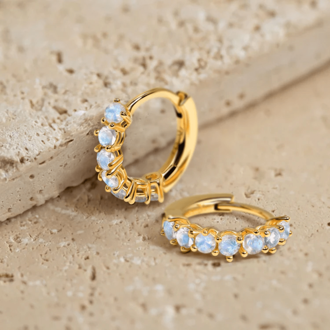 Featuring 14 genuine Moonela moonstones, these elegant hoop earrings are adorned with small round brilliant-cut stones, each measuring 2 mm x 2 mm. The hoops themselves measure 12 mm x 12 mm, creating a delicate yet sparkling statement piece.