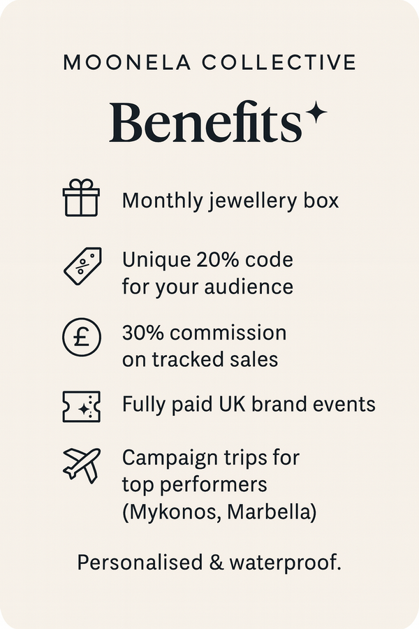 Ricevi gioielli gratuiti ogni mese, il tuo codice sconto del 20% per il tuo pubblico e una commissione del 30% sulle vendite monitorate .
